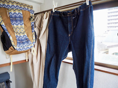 クライミングパンツならではの開脚をサポートする股下のマチ、ウェストの幅広目の総ゴム入りで大きなアクションの時の尻が出ることも防ぐ。テーパードシルエットになっているのだが余裕ある腰回り。すっきり見えるのもいい。ポケット前後二つづつもきちんと深いポケットで安物のデニムパンツにありがちな実用性低い浅く小さなポケットとは一線を画す。当たり前の機能をおろそかにしなかったのは評価できる。さらに後ろポケットは入り口が細いフラップの合わせになっていて収納品の脱落を防ぐ。よくまあディティールに凝ったものだ。